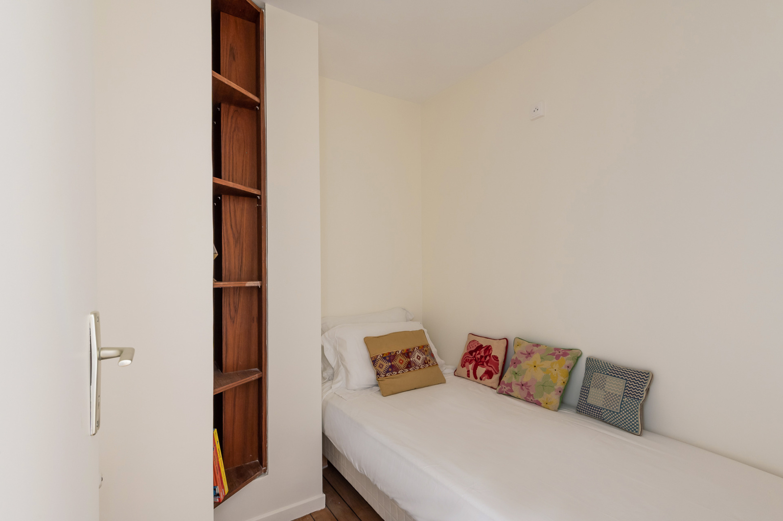 - Large windows in living room and sunny bedroom with quaint views of rue du Dragon.